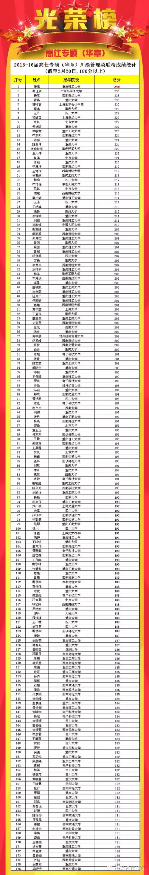 截至2月20日,高仕教育(川渝华章)2015-16届学员惊喜不断。以下为部分180分以上的成绩名单,不服来战——
